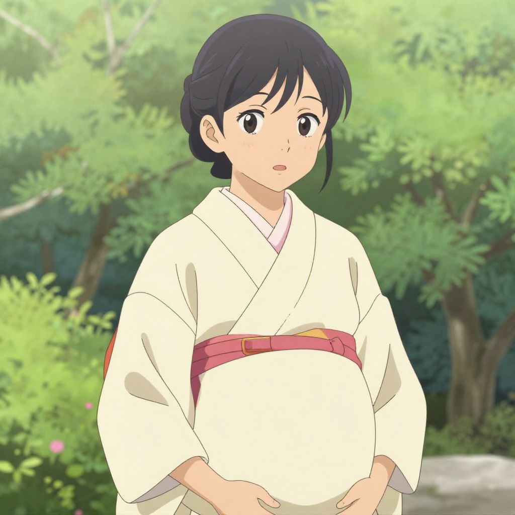 Anime-style digital drawing of a pregnant woman with black hair, wearing a white shirt, sitting in a sunlit room, gently cradling her belly