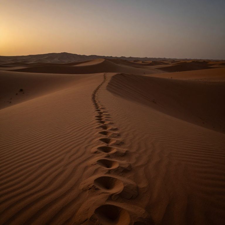 In the hushed embrace of twilight, a solitary path etched into the shifting sands whispers of resilience and purpose, as the desert's eternal dance between light and shadow mirrors the soul's journey through the unknown.