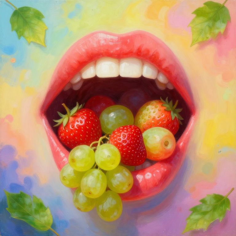 A surreal painting of a stuffed mouth overflowing with various fruits like strawberries and grapes, dreamy background with floating leaves, bright and colorful palette