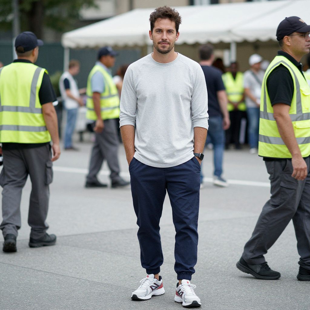 A man, light gray raglan tee, navy joggers, retro running shoes, bustling ground crew in reflective vests, kodacolor analog film, relaxed smile, casual confidence. Man has masculine face and piercing eyes