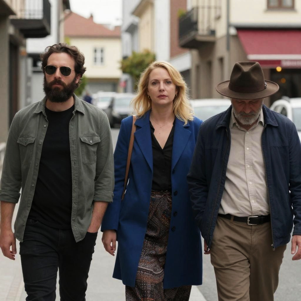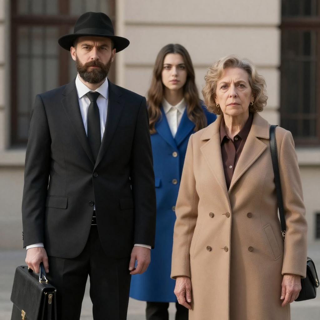 Photograph of five people walking outdoors. A woman with light brown hair in a maroon cardigan and purple blouse leads. Four bearded men in black suits and fedoras follow closely. Background includes trees, parked cars, and an iron fence. Sunlight casts shadows. All men have serious expressions.