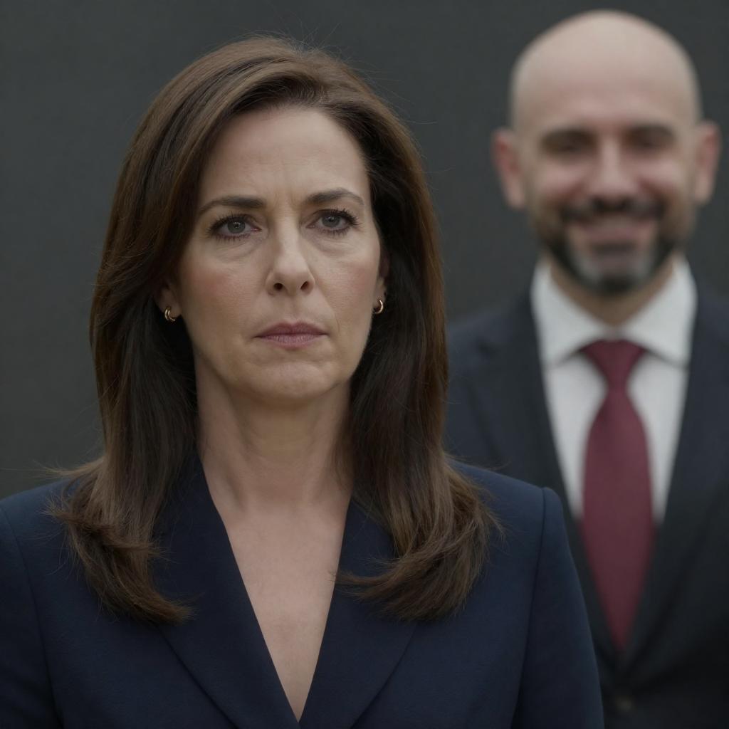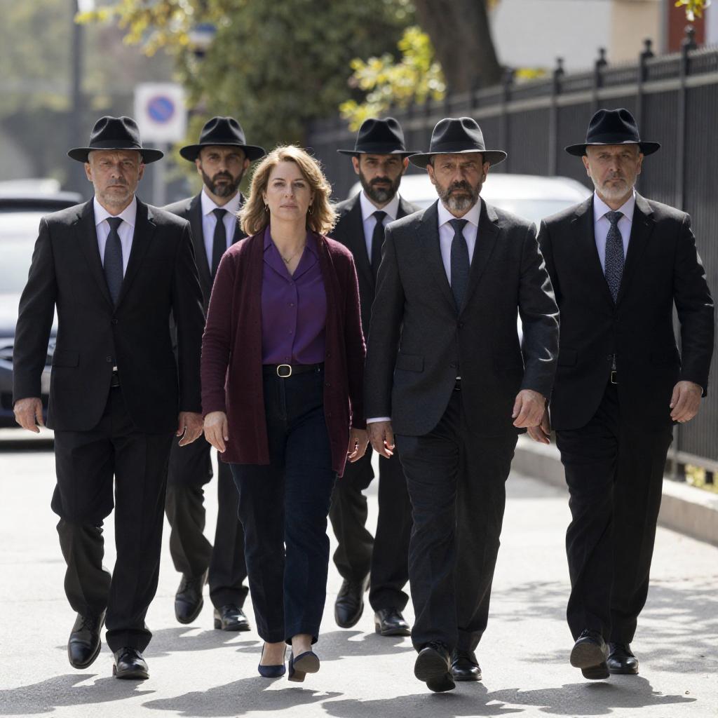 A group of six professionals walking outdoors on a sunny day. A woman with light brown hair, wearing a maroon cardigan and purple blouse, leads the group. She is followed by five men dressed in black suits, white shirts, black ties, and black fedora hats. The men have serious expressions and beards. The background shows trees, parked cars, and an iron fence along the street.
