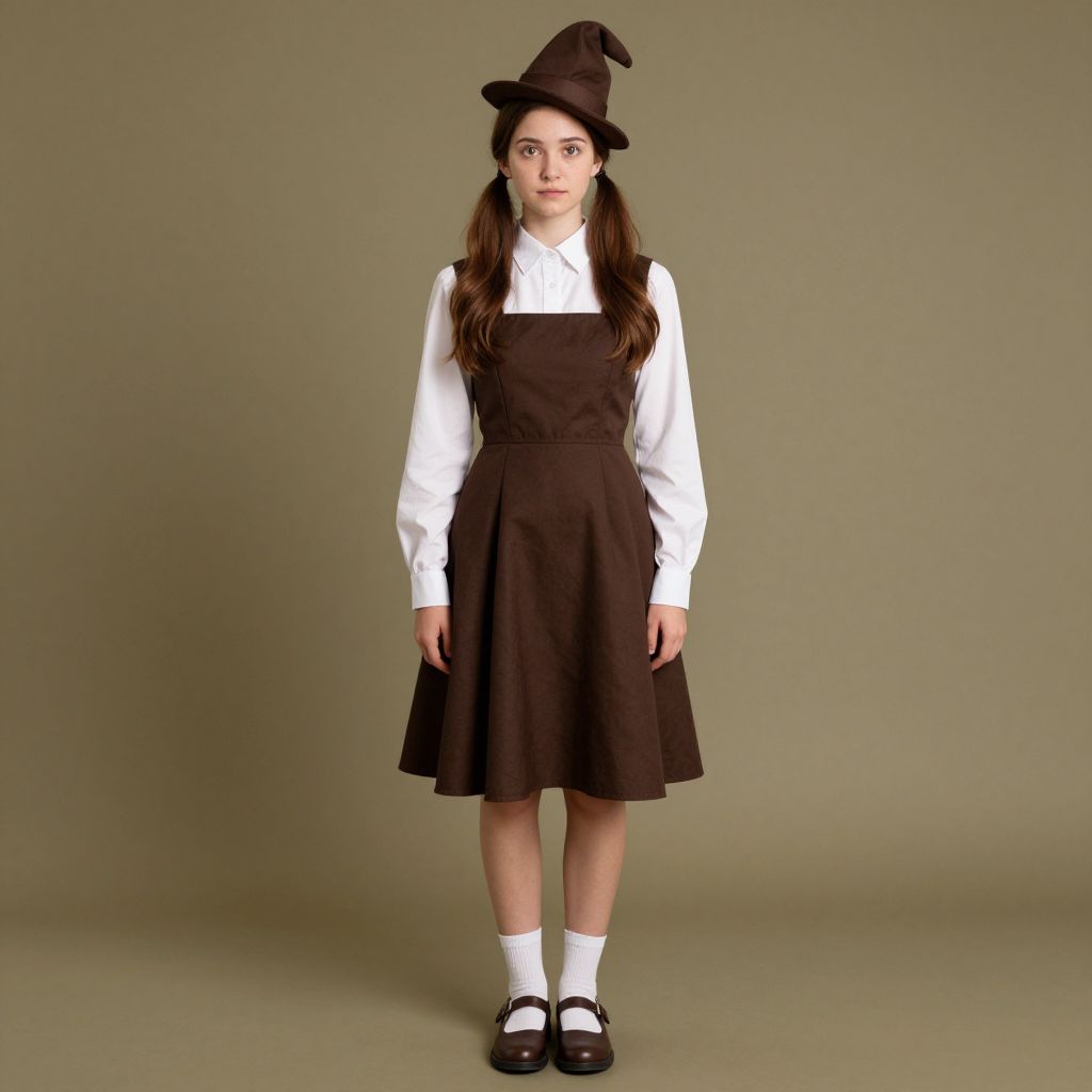 Photograph of a young girl with long brown hair, wearing a black witch hat, white shirt, black pinafore dress, white socks, and