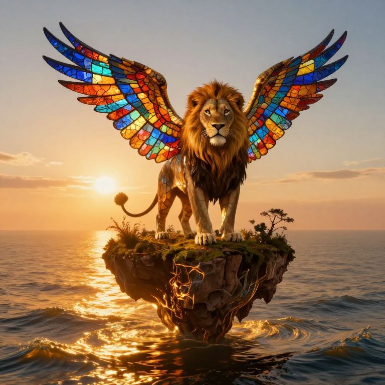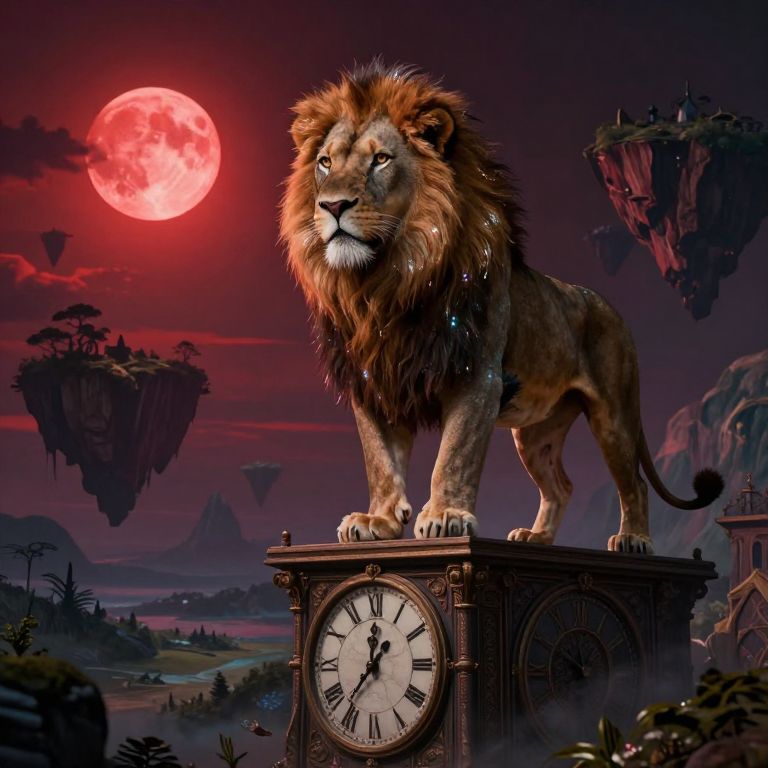 Digital art of a golden lion with a flowing mane standing on a glass block in golden water, surrounded by clocks and lit lanterns at sunset.