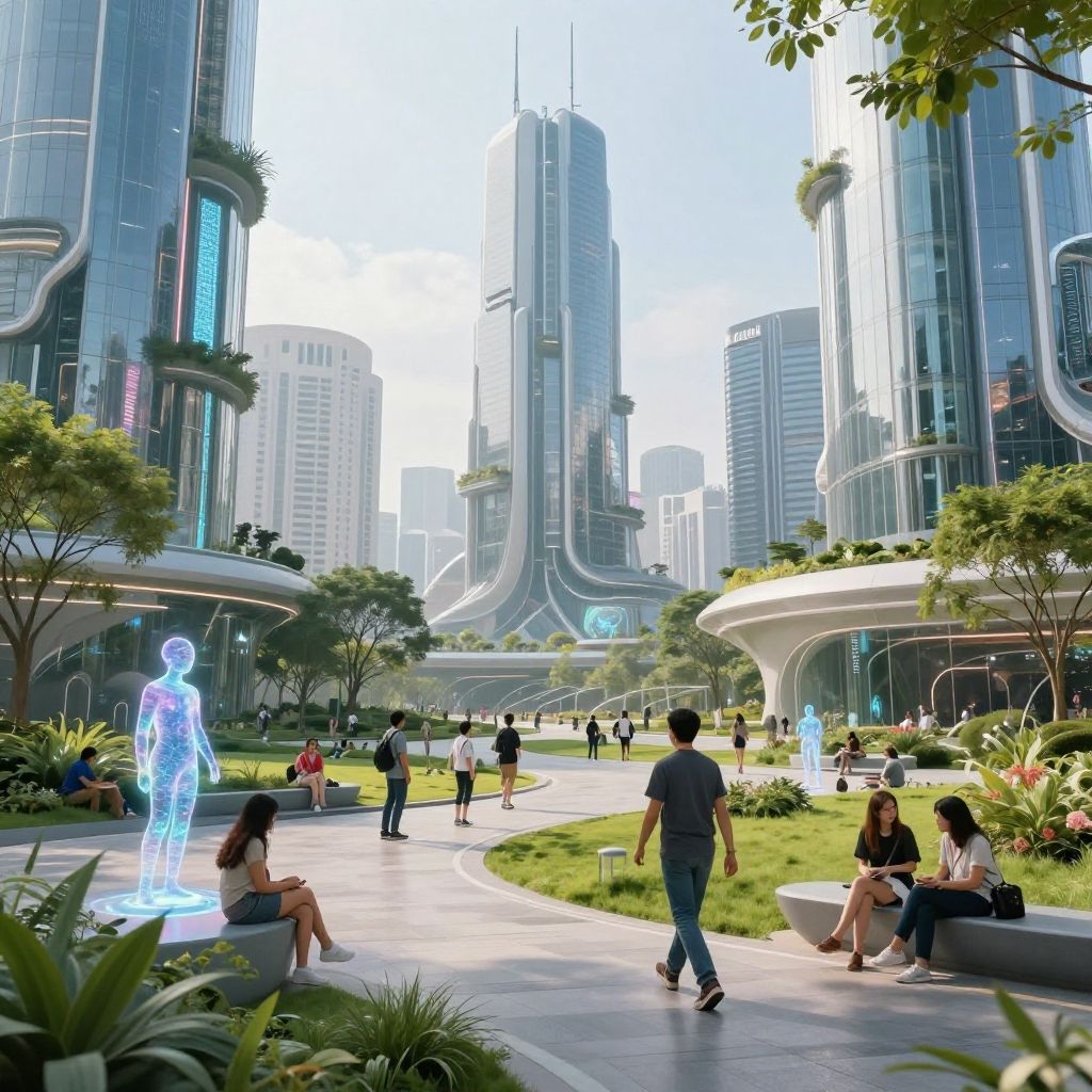AI utopia futuristic urban park, diverse people interacting with AI companions, clean energy sources powering the city, transparent skyscrapers with greenery, morning soft light, artwork blending realism and cyberpunk