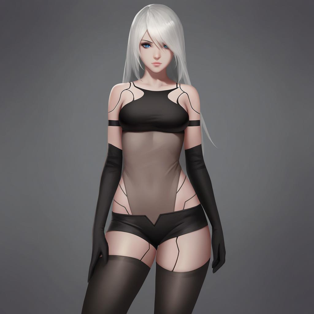 A2 nier automata, 1girl, mole under mouth, lips, blue eyes, hair between eyes, hair over one eye, white hair, long hair, medium breasts, elbow gloves, black gloves, black thighhighs, black shorts, short shorts, bare shoulders, android, robot joints, tank top, armlet, joyful girl with strawberry blonde hair and bright blue eyes, realistic, intricate anatomy, realistic skin tone, casual expression, elegant posture, denim texture, bare shoulders, functional clothing, slender fingers, simple background