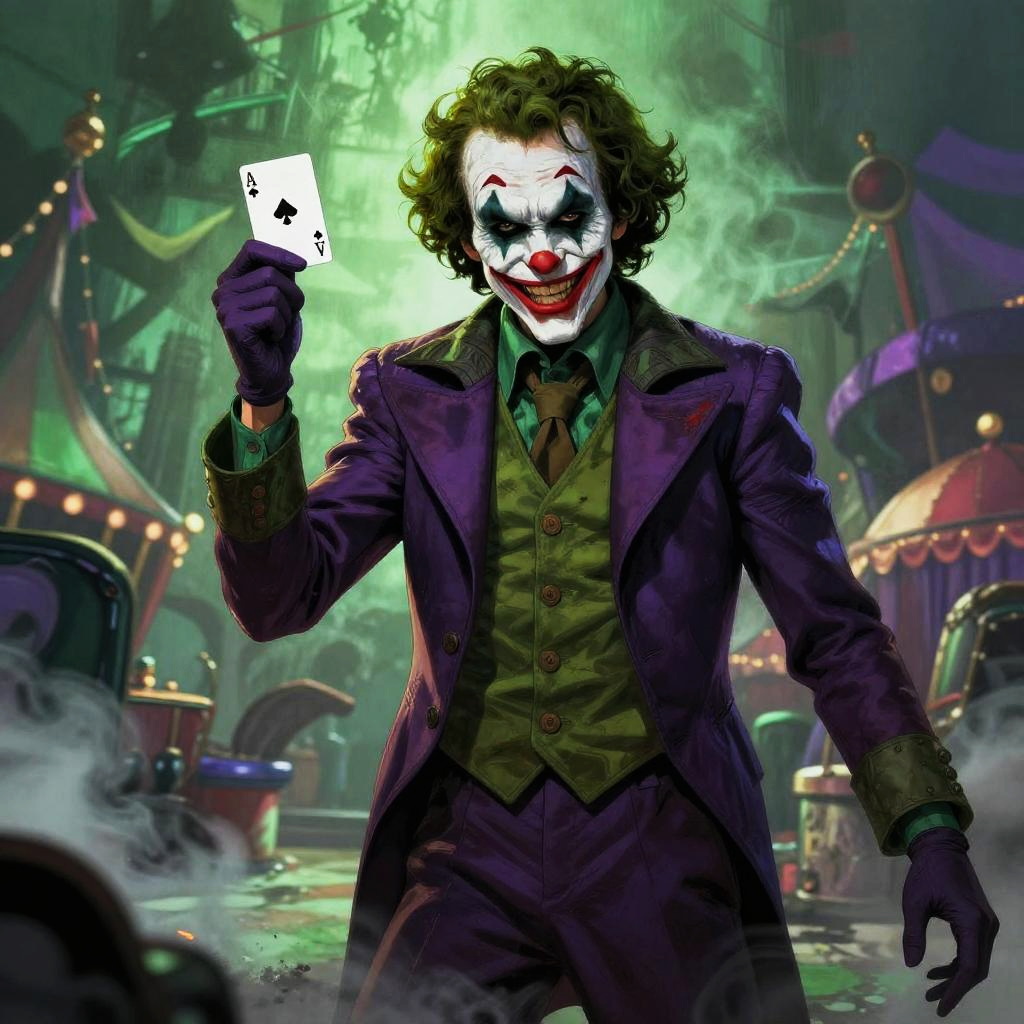 The Joker holding card, sinister expression, smoky carnival background, detailed costume texture, eerie green and purple hues, dynamic pose, surreal comic art style
