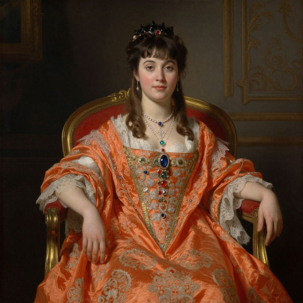 A French academic-style portrait reminiscent of Delphin Enjolras' work, featuring a woman elegantly seated in a richly detailed red chair, adorned in a vibrant orange gown with intricate lace detailing and embellished with delicate jewelry, captured in a high-definition, classical painting medium with dramatic lighting that highlights her poised demeanor against a dark, ornate backdrop.