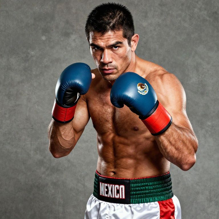 Photograph of a muscular, tan-skinned male boxer with short black hair, wearing blue and red gloves, green and white "MEXICO"