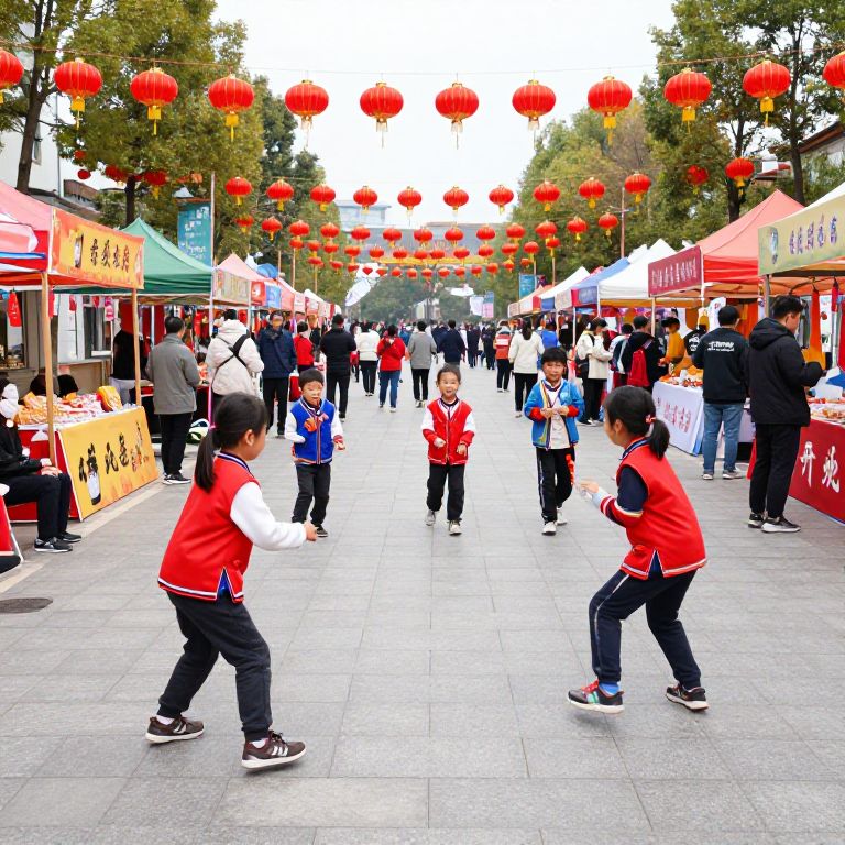 Kids playing traditional games during a seasonal festival in a vibrant outdoor market filled with colorful stalls and festive decorations