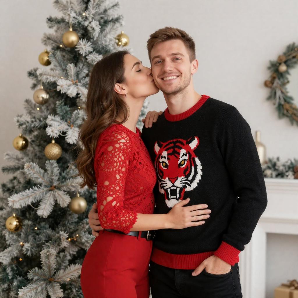 Photograph of a smiling couple in winter clothing. The man, with short brown hair, wears a black coat and brown boots, sitting with his arm around the woman. She has long brown hair, wears a red plaid coat, and holds a blue smartphone, taking a selfie. They are in front of a festive, glittery background with red and gold decorations.
