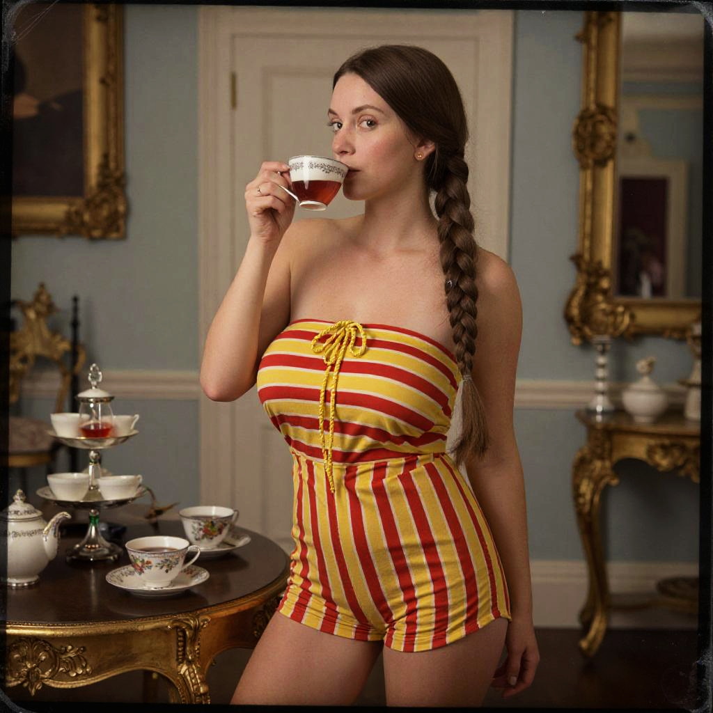 Young woman with long braided hair wearing a red and yellow striped bandeau romper with a drawstring tie, enjoying tea from a delicate porcelain cup. She stands in an elegantly decorated historic mansion room with ornate gold-framed mirrors and furniture. The vintage tea service includes a teapot and tiered tray with teacups and saucers.