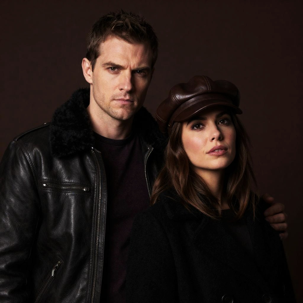Photograph of a rugged man and woman with winter attire. Man in dark leather jacket with fur collar, short brown hair, serious expression. Woman in brown leather cap, black coat, looking upwards, soft expression. Dark, ured background. Man's arm around woman's shoulders.