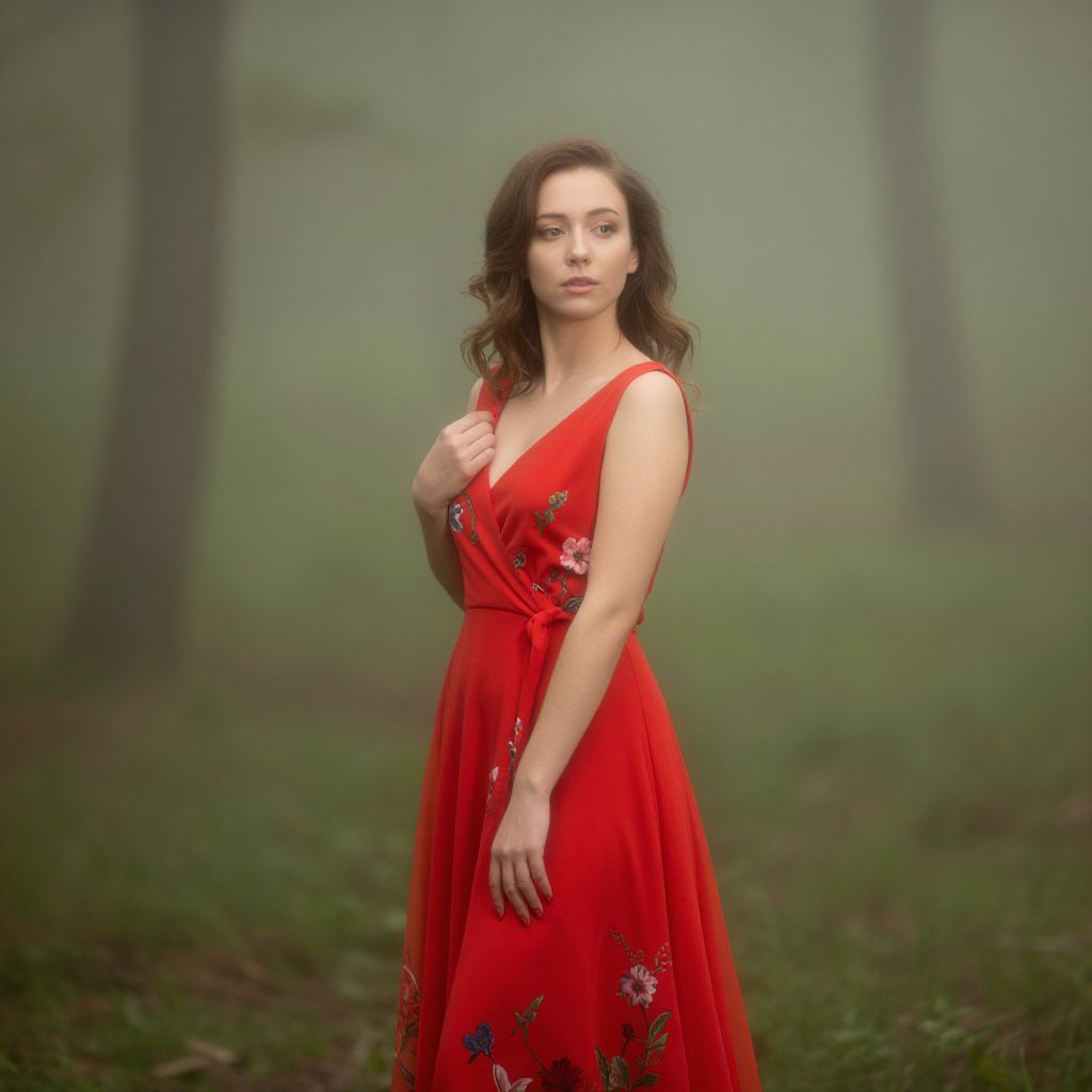 A woman stands gracefully in a misty forest, wearing a vibrant red dress adorned with floral patterns. The soft natural light and blurred background enhance the serene and ethereal atmosphere of the portrait.