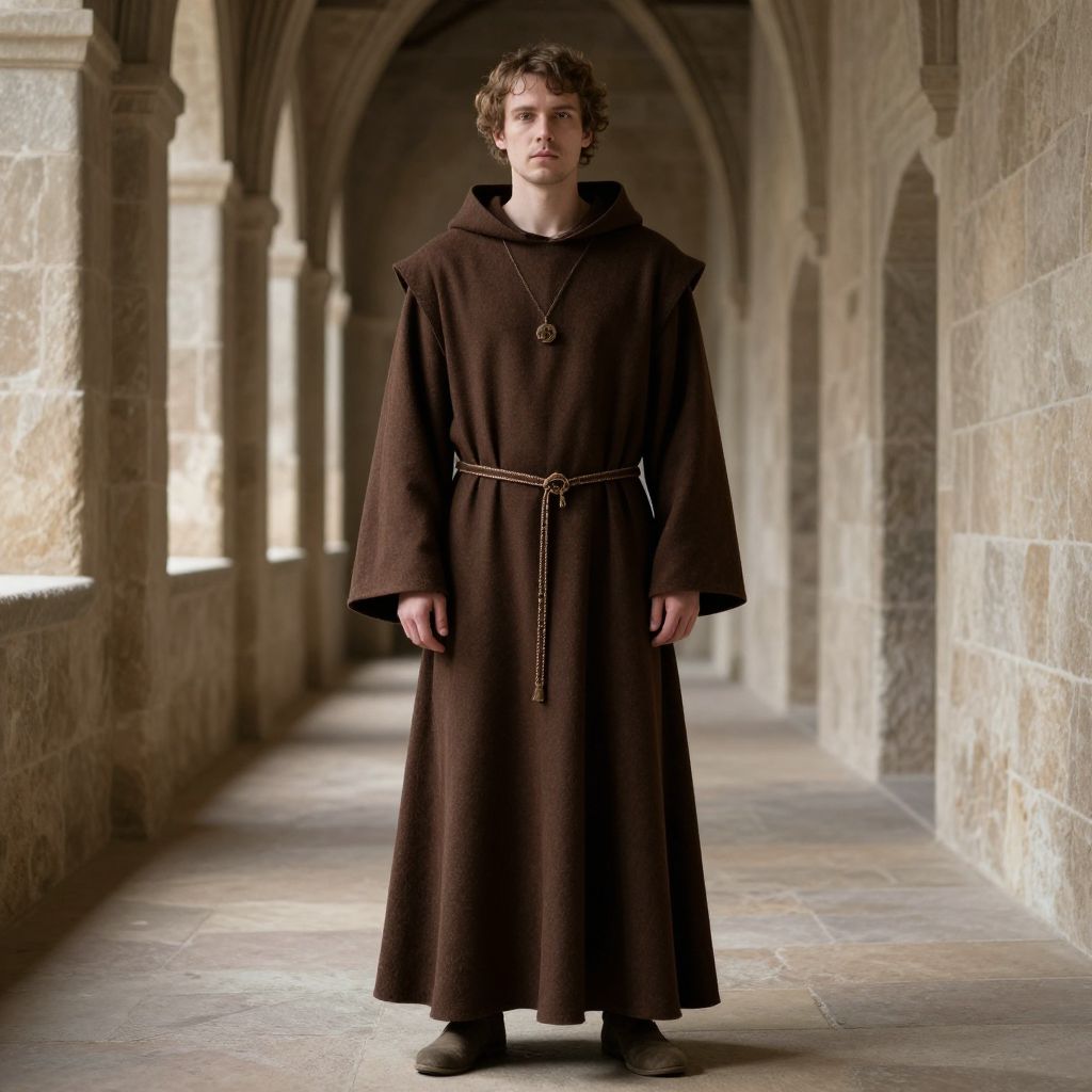 Medieval monk outfit, man in a brown robe standing in a hallway