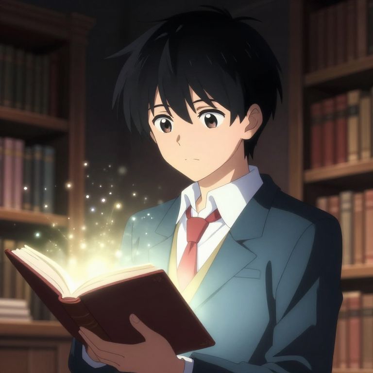 This digital anime-style illustration depicts a young man with short, black, tousled hair and large, expressive brown eyes. He is wearing a dark blue suit jacket over a white dress shirt with a red tie. He is holding an open book emitting a bright, magical glow with sparkling particles. The background features dark wooden bookshelves filled with books, suggesting a library setting. The lighting focuses on the book, creating a contrast with the darker surroundings. The young man's expression is one of surprise or concentration. The image is rich in warm and dark tones, with a sense of mystery and magic.