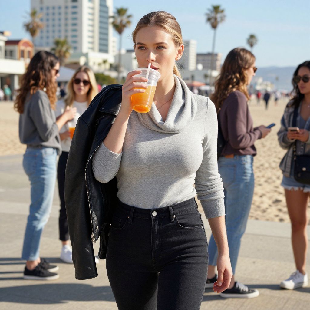 A slim woman in a grey cowl neck sweatshirt and fitted black denim pants stands at a fashionable boardwalk in Santa Monica, draped black leather jacket over her shoulder. She is enjoying a sunny day, sipping a drink while chatting with friends. The scene is captured in an IB technicolor film stock style, enhancing the vibrant colors of the surroundings. Sexy. Pretty face and beаutiful eyes. Big breasts