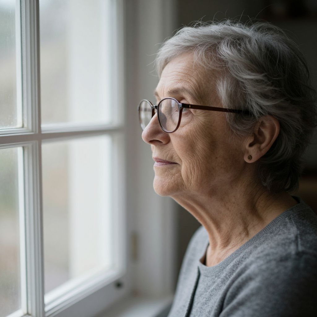 Photograph of an elderly woman with gray hair, glasses, and gray sweater, gazing thoughtfully out a sunlit window.