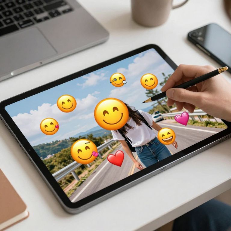 How to add emojis to a photo captured in a modern workspace with a large touchscreen tablet, lively emojis like smiley faces and hearts being placed on a travel photo, dynamic and fun atmosphere with soft lighting and tech-savvy vibe.