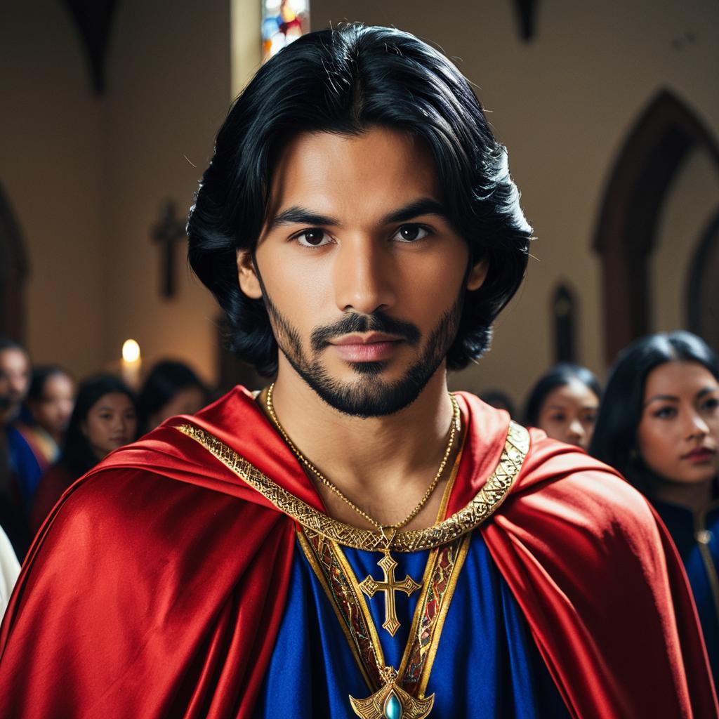 Fancy dress king ,crown, realistic, male focus, red cape, 1boy, cape, looking at viewer, blurry background, blurry, solo, jewelry, closed mouth, black hair, solo focus