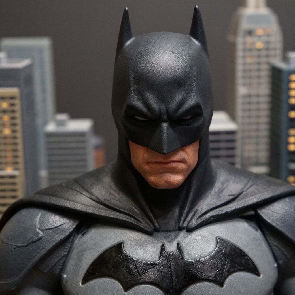 Realistic photo, photorealistic, hyperrealistic, intricate details, Masterpiece illustration, amazing detailed face, perfect face, marvel legends, batman, looking down at city from the rooftop, cape, plastic, detailed city with tall buildings, ambient light, rim light, (action figure:1.3), diorama toy set