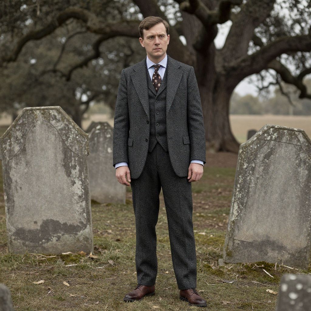 Photograph of a Caucasian man with short brown hair, standing in a cemetery. He wears a black tweed three-piece suit with a white shirt and dark tie adorned with small polka dots. His expression is serious and slightly solemn. The background features several weathered gravestones, and a large, dark tree with sprawling branches. The ground is covered in grass and scattered leaves. The man's brown shoes are polished, and the overall mood is somber and reflective. The lighting is natural, with overcast skies adding a muted, grayish tone to the scene.