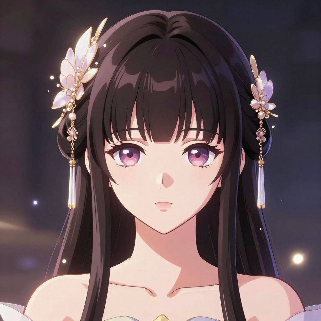Hime haircut anime illustration showing a noble princess with glossy dark hair, symmetrical blunt bangs and side locks, intricate hair accessories, surrounded by magical glowing particles.