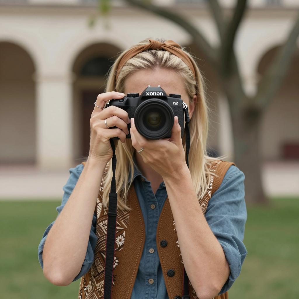 Man with red hair, wearing black suit and blue shirt, stands behind green wooden fence, holding black camera to his eye. Bushes with white flowers fill background. Man's head partially obscured by camera. Upper body visible, arms raised.