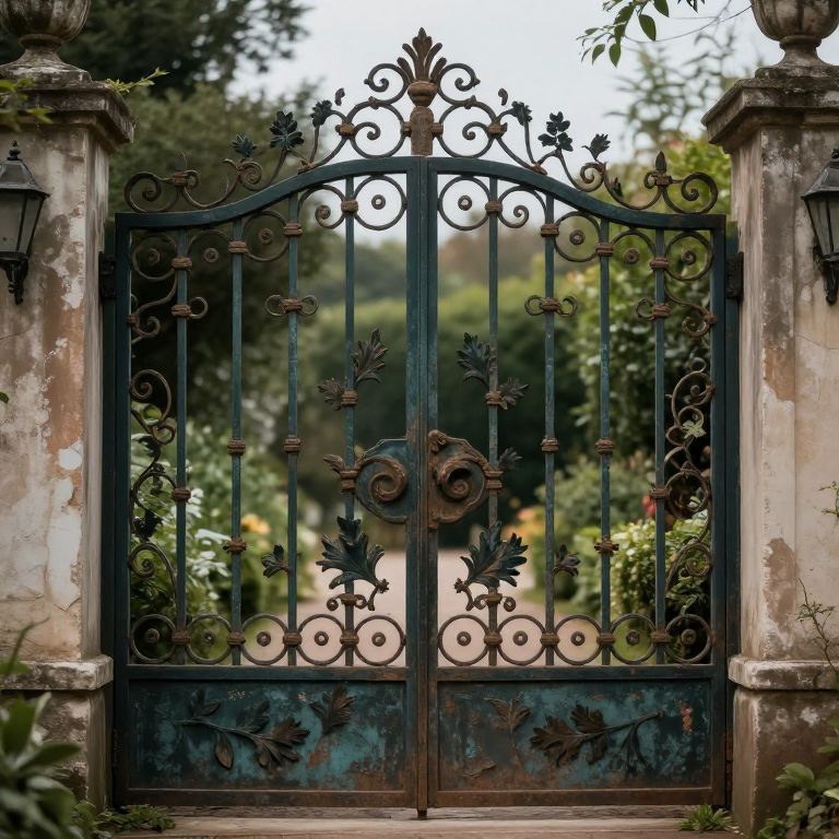 Ornamentais decorative wrought iron gates with elaborate scrolls and leaf motifs, aged patina finish, set in a vintage garden entrance, overcast lighting for moody ambiance, highly detailed digital illustration