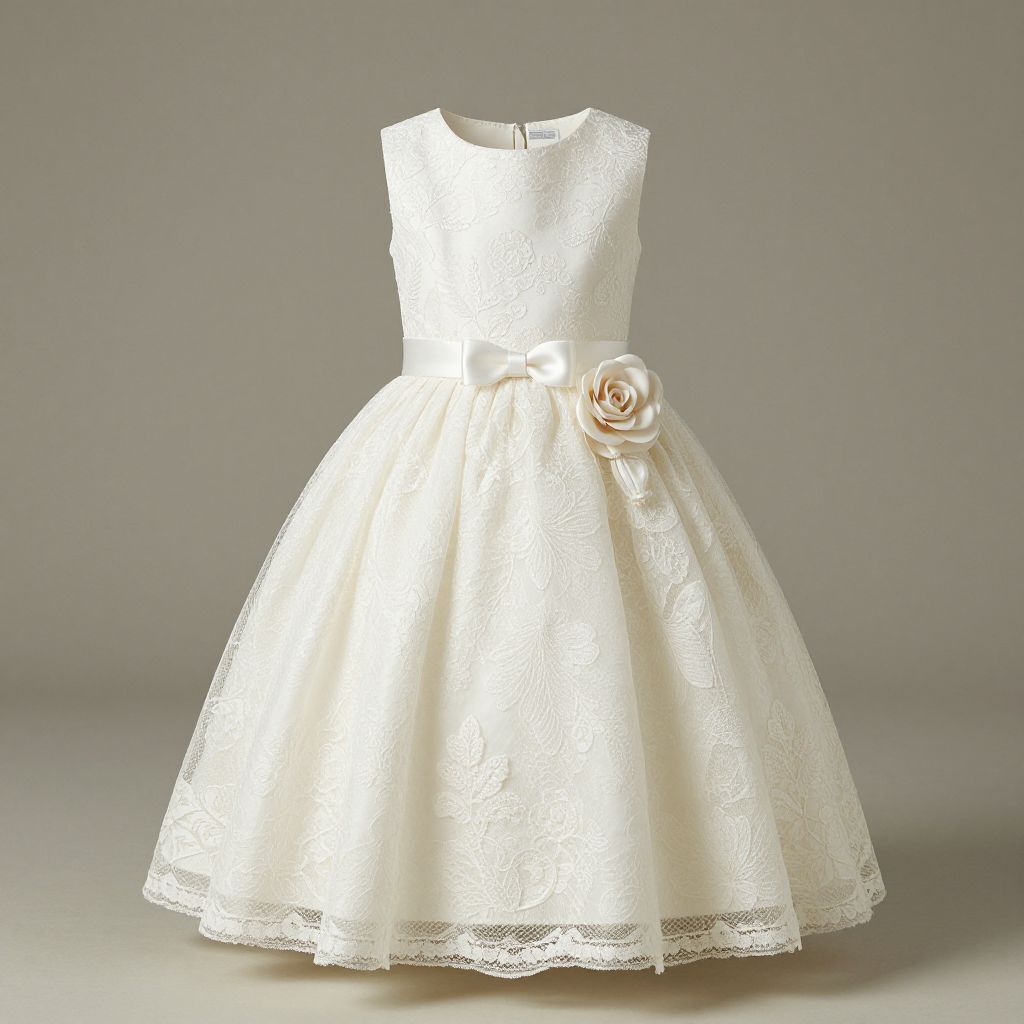 Elegant lace flower girl dress featuring a sleeveless bodice with intricate floral embroidery, a fitted waist accented by a white satin bow, and a full skirt adorned with a large cream rose embellishment, set against a neutral background.