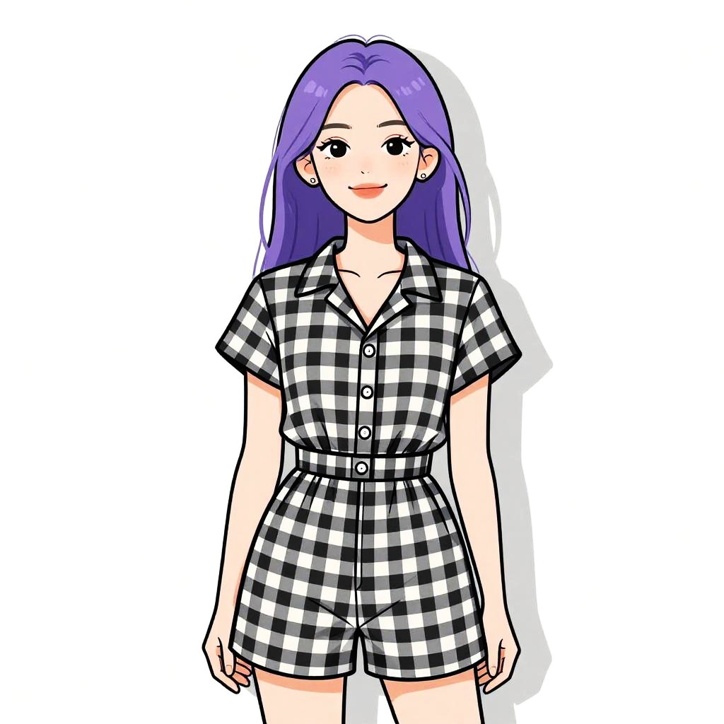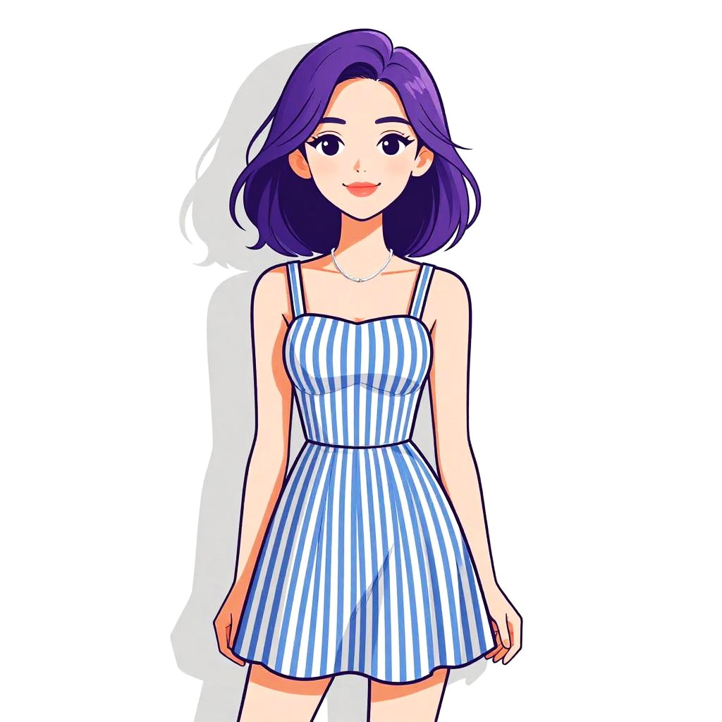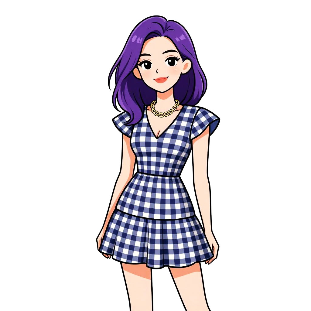 Digital anime-style drawing of a smiling woman with purple hair, wearing a blue and white checkered dress and necklace, standing against a white background.