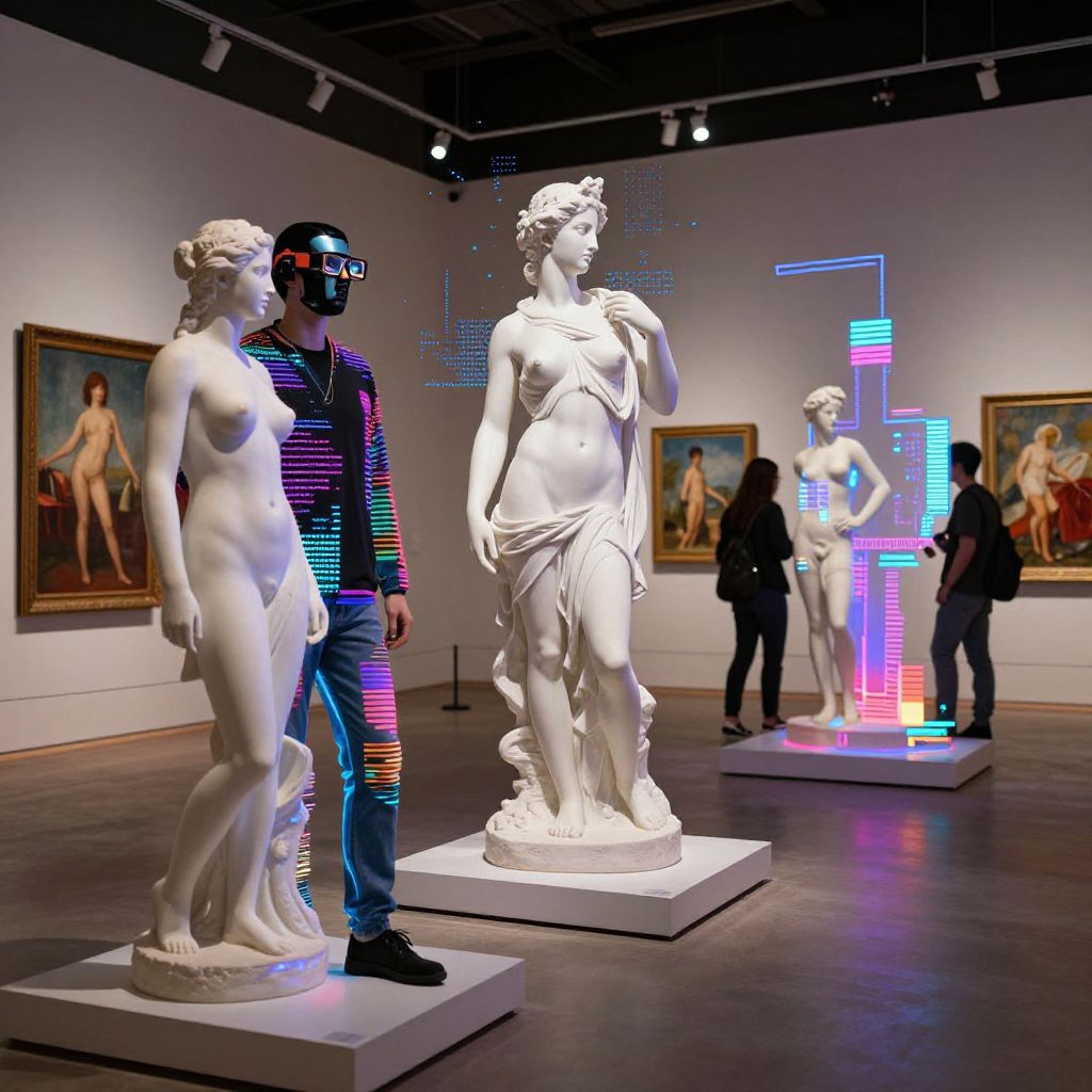 Adult art AI gallery installation, a visually striking composition combining augmented reality figures with classical nude sculptures, vibrant colored lights and pixelated effects, showcasing the intersection of traditional adult art and cutting-edge AI technology.