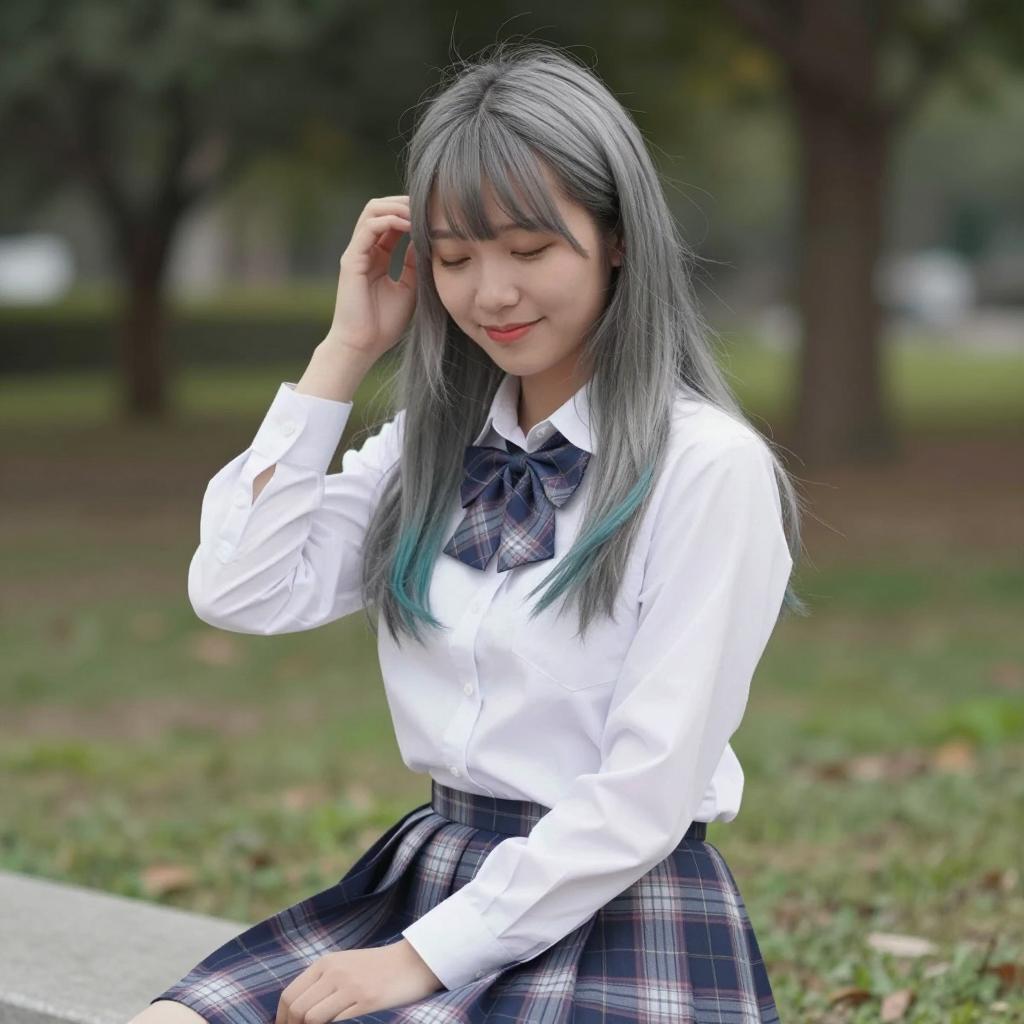 Asian woman with long grayish hair, bangs, and blue-green highlights, sitting outdoors. She wears a white shirt, blue plaid bow tie, and purple plaid skirt. Her right hand touches her hair, smiling with closed eyes. Background: blurred greenery and trees. Light bokeh effect. She sits on a stone. Casual, candid photograph.
