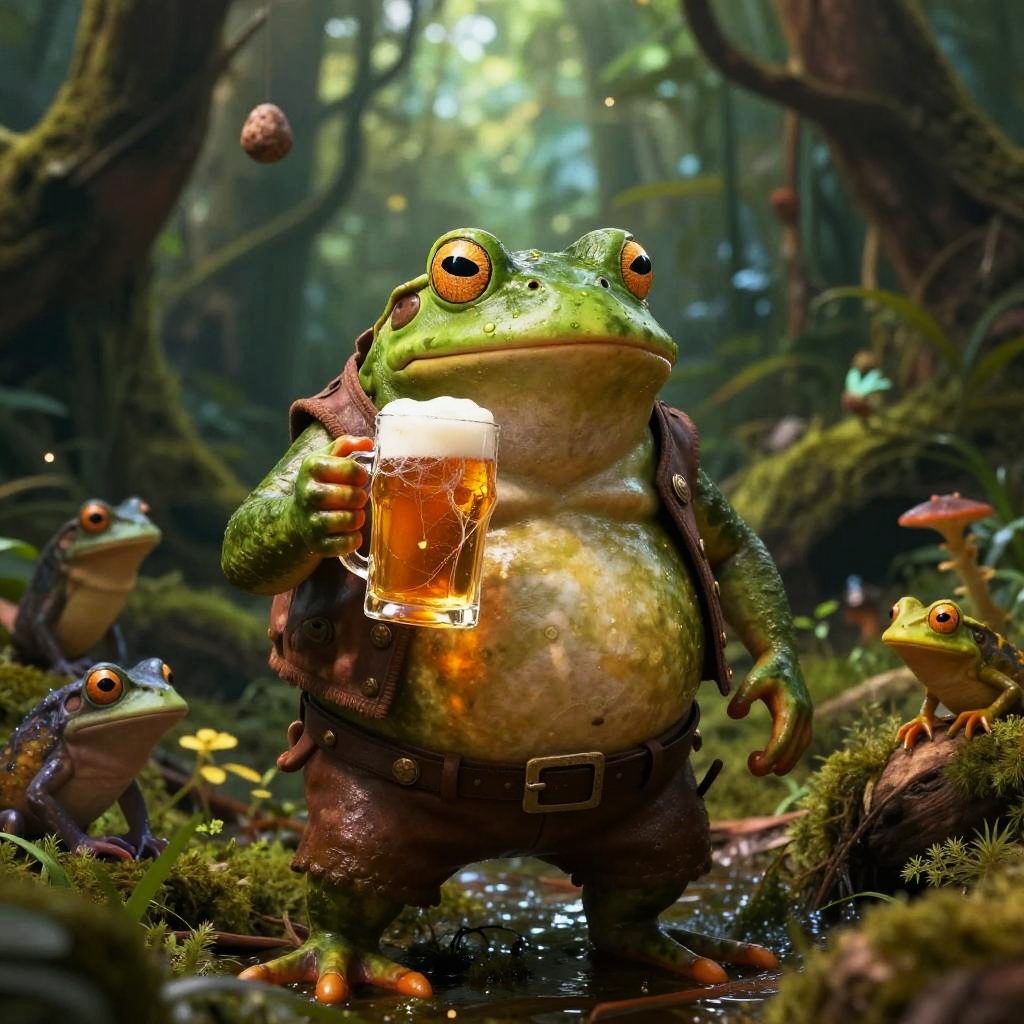 Charismatic, rotund frog tavern keeper in a lush swamp, Frothy amber beer in webbed hands, Dressed in rustic vest and breeches, Surroundings teeming with life, Realistic and fantasy style, Invites all creatures for a swig, Magical other-world feel, Finest swamp-brewed beer.