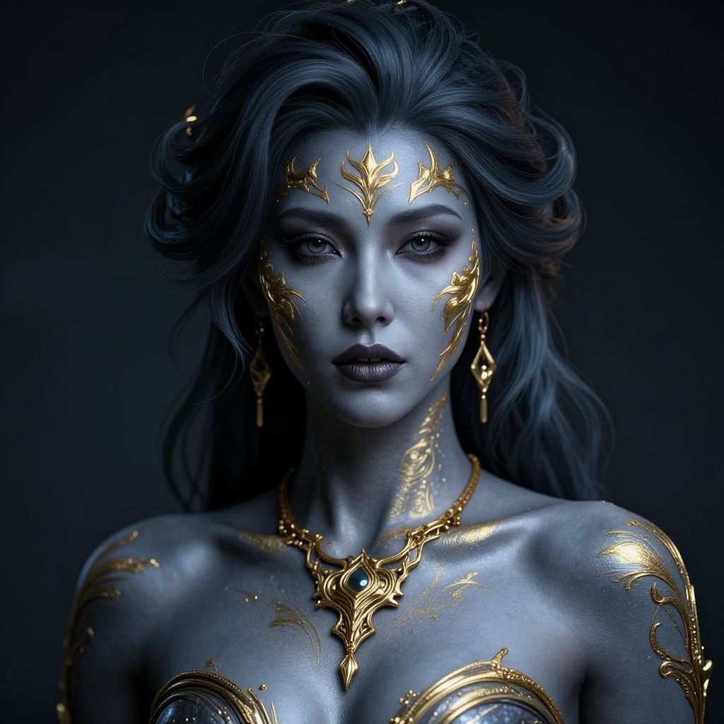 A striking digital portrait of a woman with metallic gray-blue skin adorned with intricate golden ornamental designs on her face and body. The artwork features a strong fantasy and sci-fi aesthetic, highlighted by swirling hair elements and a detailed ornamental necklace, emphasizing elegance and mystique.