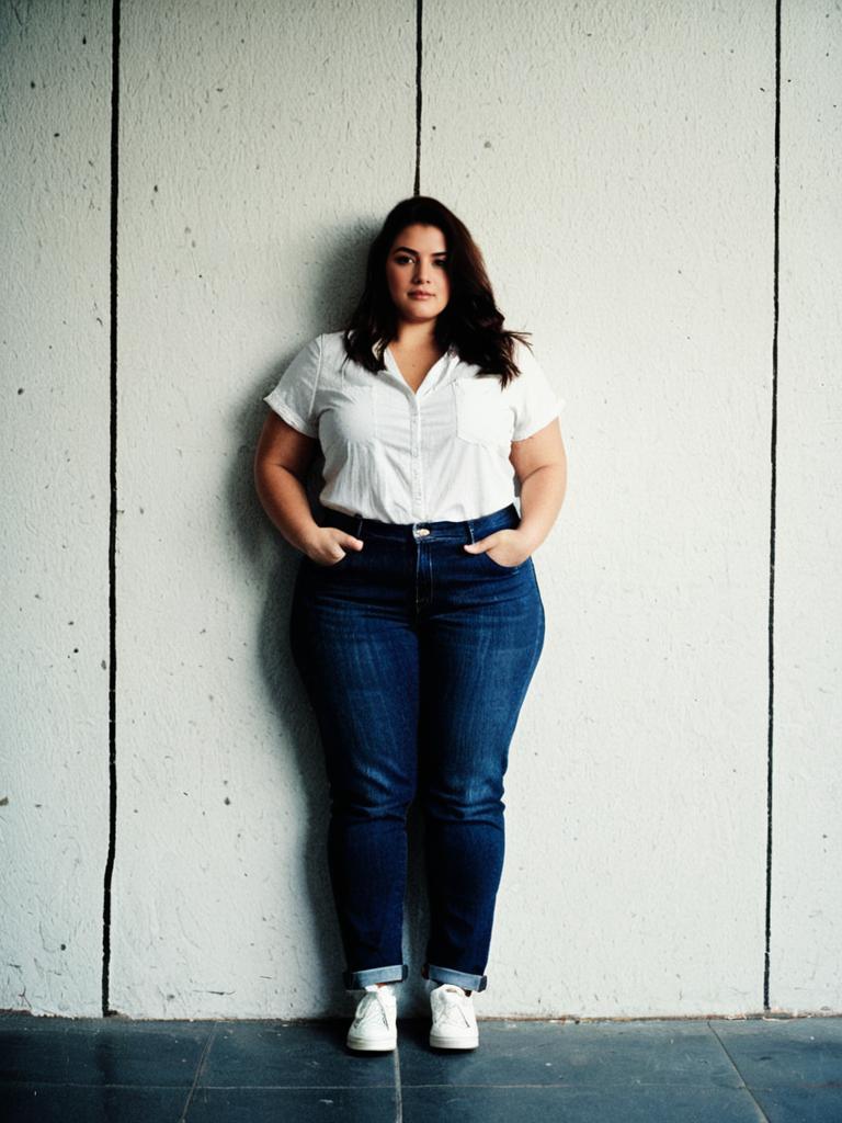 Plus Size Woman Plus Jeans, a woman in a white shirt and jeans standing in front of a wall