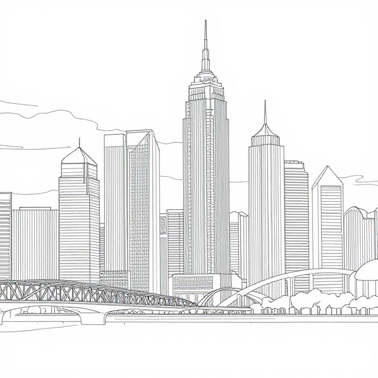 This is a black-and-white line drawing of a city skyline, featuring a prominent central skyscraper with a pointed spire. Surrounding it are several other tall buildings with varied architectural styles, including rectangular and triangular shapes. The drawing includes simple, thin lines representing trees and small buildings in the foreground. The background is minimal, with a few cloud-like shapes in the sky. The overall style is clean and precise, emphasizing the architectural details and the verticality of the skyscrapers. The image focuses on the symmetry and scale of the urban landscape.
