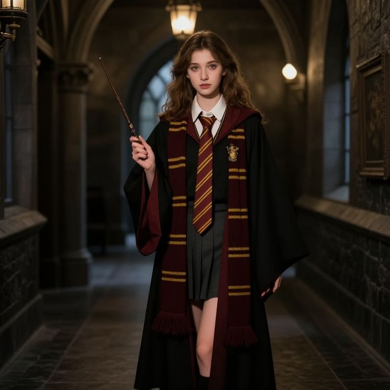 Hogwarts uniform female student standing in a magical castle corridor, wearing traditional black robe with house colors, holding a wand, detailed fantasy lighting, cinematic style