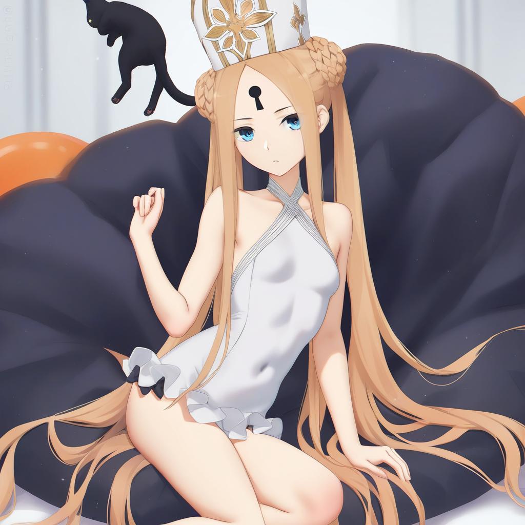 Abigail williams (swimsuit foreigner) (second ascension) (fate), fate/grand order, 1girl, blue eyes, blonde hair, very long hair, parted bangs, sidelocks, double bun, twintails, braided bun, small breasts, thighs, covered navel, white one-piece swimsuit, dress swimsuit, white headwear, bare shoulders, orange bow, black bow, multiple bows, forehead, black cat, keyhole, mitre, white hat, by artist miura-n315, leet