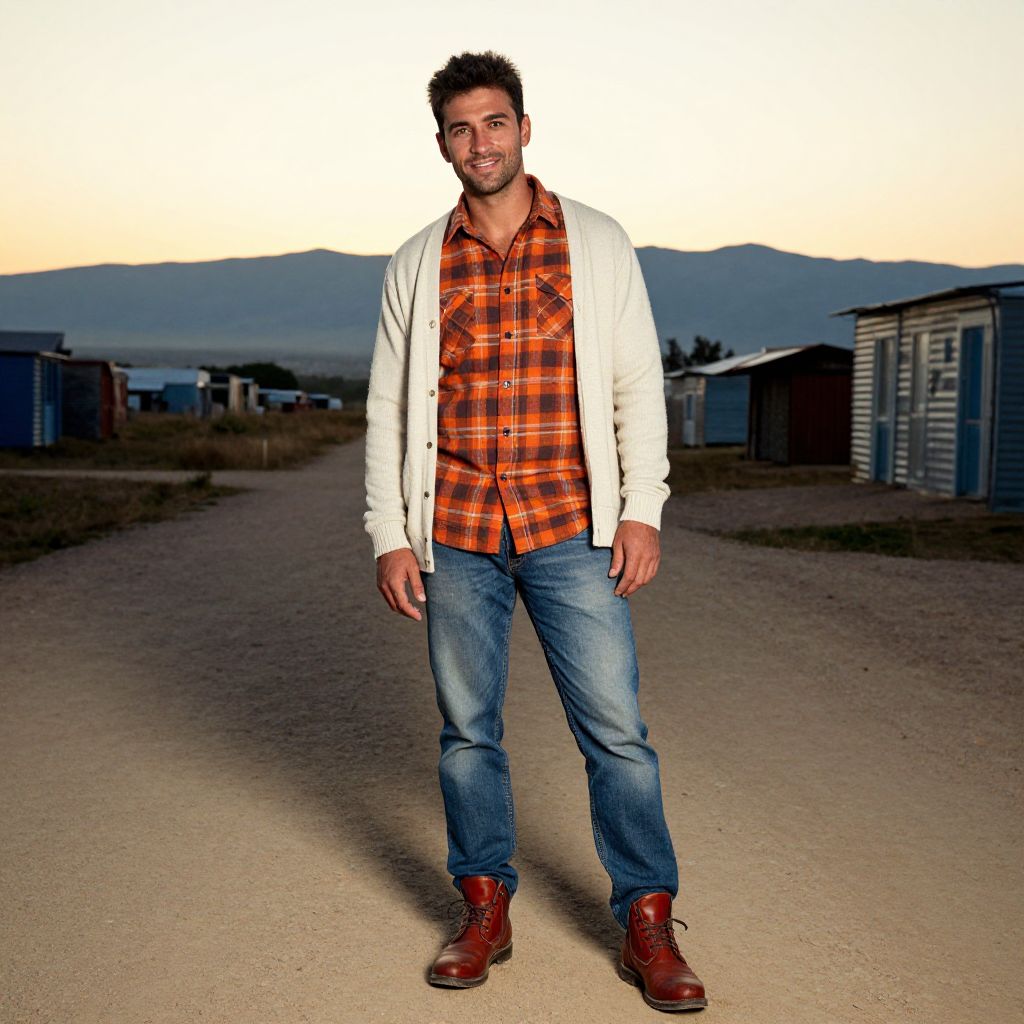 A man, burnt orange flannel shirt, faded denim jeans, chestnut brown leather chukka boots, lightweight cream cardigan, dusty roads, corrugated iron shacks, distant mountains silhouetted at sunset, oversaturated film, relaxed smile.Man has masculine face and piercing eyes