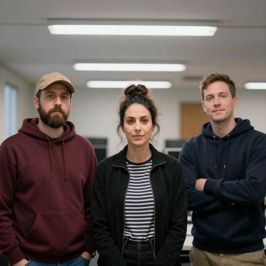 Black-and-white photograph of three men in a workshop. The man on the left wears a white lab coat with a patterned scarf, the middle man has a beard and wears a white shirt, and the right man has dreadlocks and wears a dark sweater. They stand near a workbench with tools and a brick wall in the background.