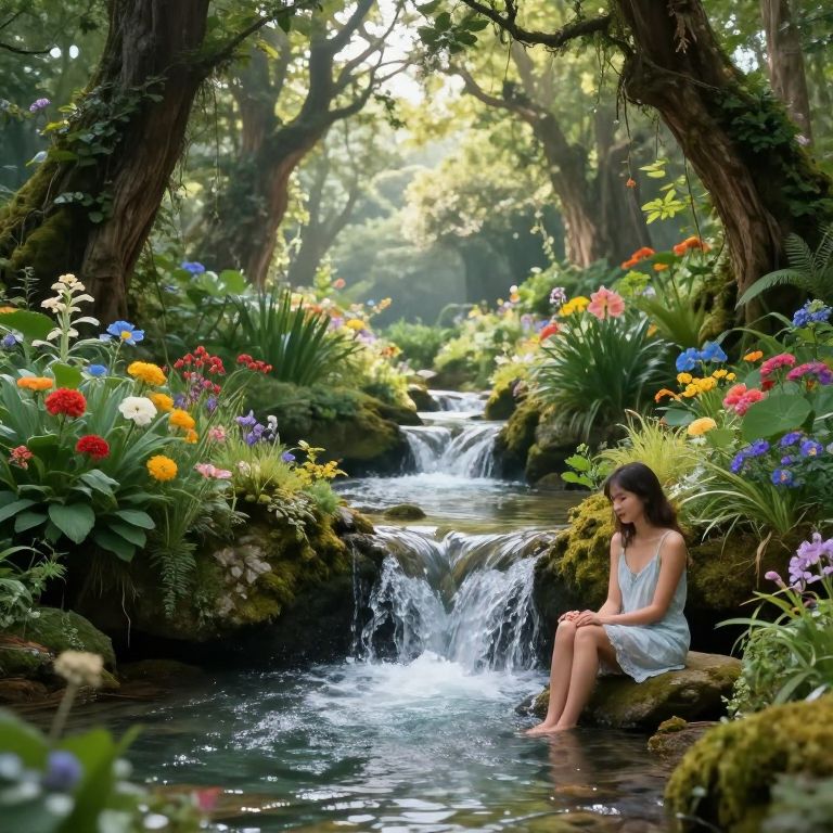 Tabaxo sitting peacefully by a crystalline waterfall in an enchanted valley, surrounded by lush greenery and colorful flowers, soft morning light filtering through ancient trees, serene and tranquil atmosphere, highly detailed nature textures and gentle water reflections.
