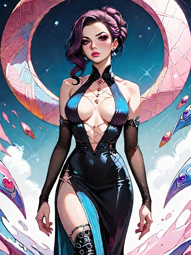 1girl, realistic face, Backless slip dress, luxurious silk, rich burgundy, intricate embroidery along hem, side slit detail, complemented by a tailored blazer, structured shoulders, black leather ankle boots, statement ring, clutch with metallic accents, sleek ponytail hairstyle.