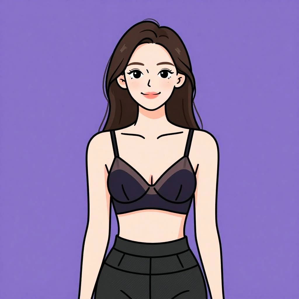 Digital anime-style drawing of a smiling woman with long brown hair, wearing a black bra and high-waisted black pants, against a solid purple background