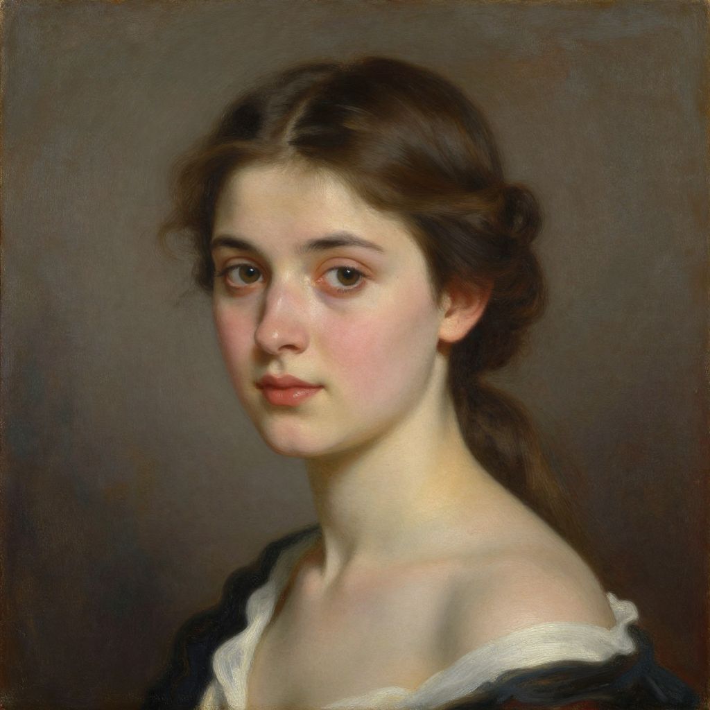 Classical portrait painting of a young woman with fair skin, brown eyes, and brown hair in a braid, wearing a white blouse, against a