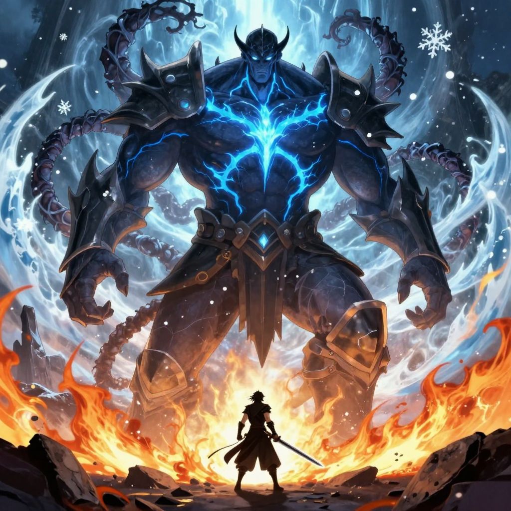 Digital fantasy artwork depicting a towering, muscular, armored demon with glowing blue energy lines and horns, standing menacingly behind a blazing fire. The demon's dark, metallic armor contrasts with the bright, swirling blue and white energy patterns. In the foreground, a silhouetted warrior with a sword stands confidently, facing the demon. Snowflakes fall around the demon, adding a cold, contrasting element. The background is a dark, stormy sky, enhancing the dramatic, epic confrontation. The artist uses vibrant colors and dynamic lighting to create a sense of intense, magical conflict.
