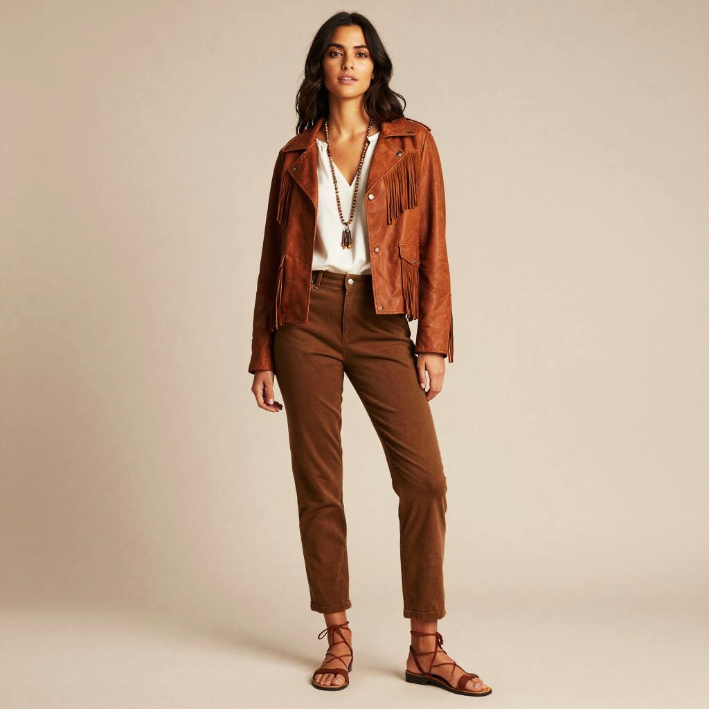 Teenage girl, long feathered hair, petite frame, 70s theme outfit, retro 70s style, ruffled peasant top, fringed leather jacket, high-waisted culottes, lace-up sandals, choker necklace, retro boho