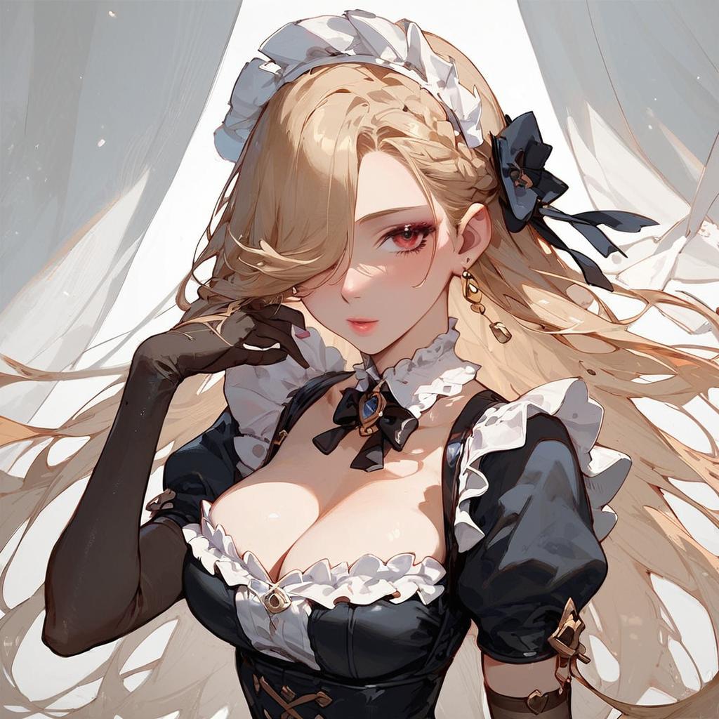 Score_9, score_8_up, score_7_up, score_6_up, source_anime, blonde hair, twintails, hair ornament, hair ribbon, choker, harness, black skirt, black and white dress, detached sleeves, black sleeves, thigh strap, platform boots, sitting, table, chair, teapot, smile, closed eyes
