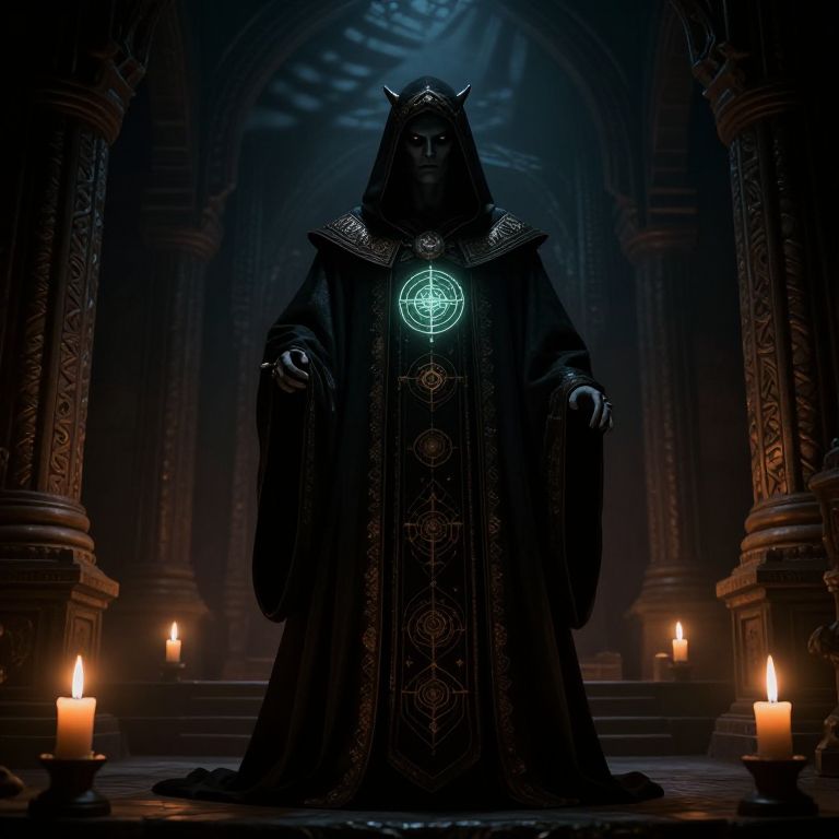 Portrait of a hypnosys master shrouded in a cloak of swirling shadows and luminous threads, seated in a room filled with ancient runes and floating dream orbs, dim mystical lighting emphasizing the hypnotic power, rich textures and a mysterious, enchanting setting.
