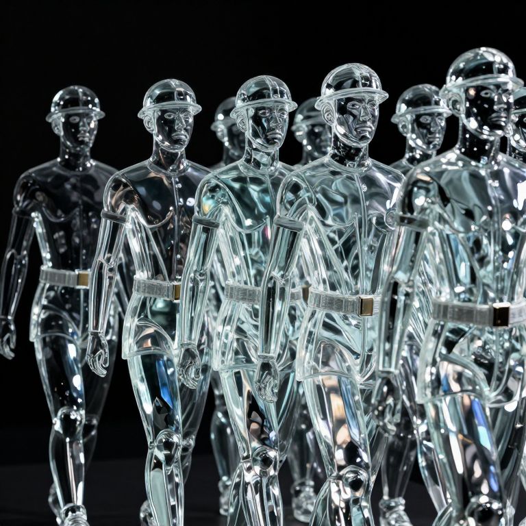 Soldiers of glass march in silent formation, their reflections—if caught in mid-stride—revealing alternate selves who never existed in this dimension.